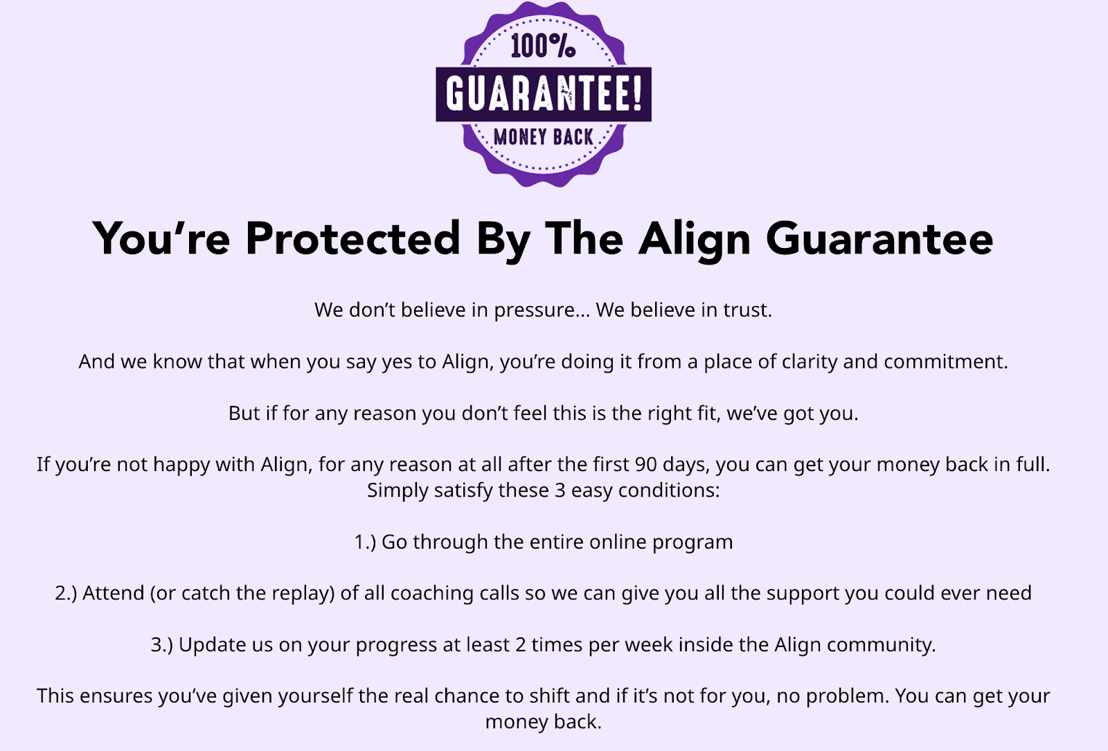 She’ll refund you in full IF you complete the program, attend the calls, and post updates twice a week.