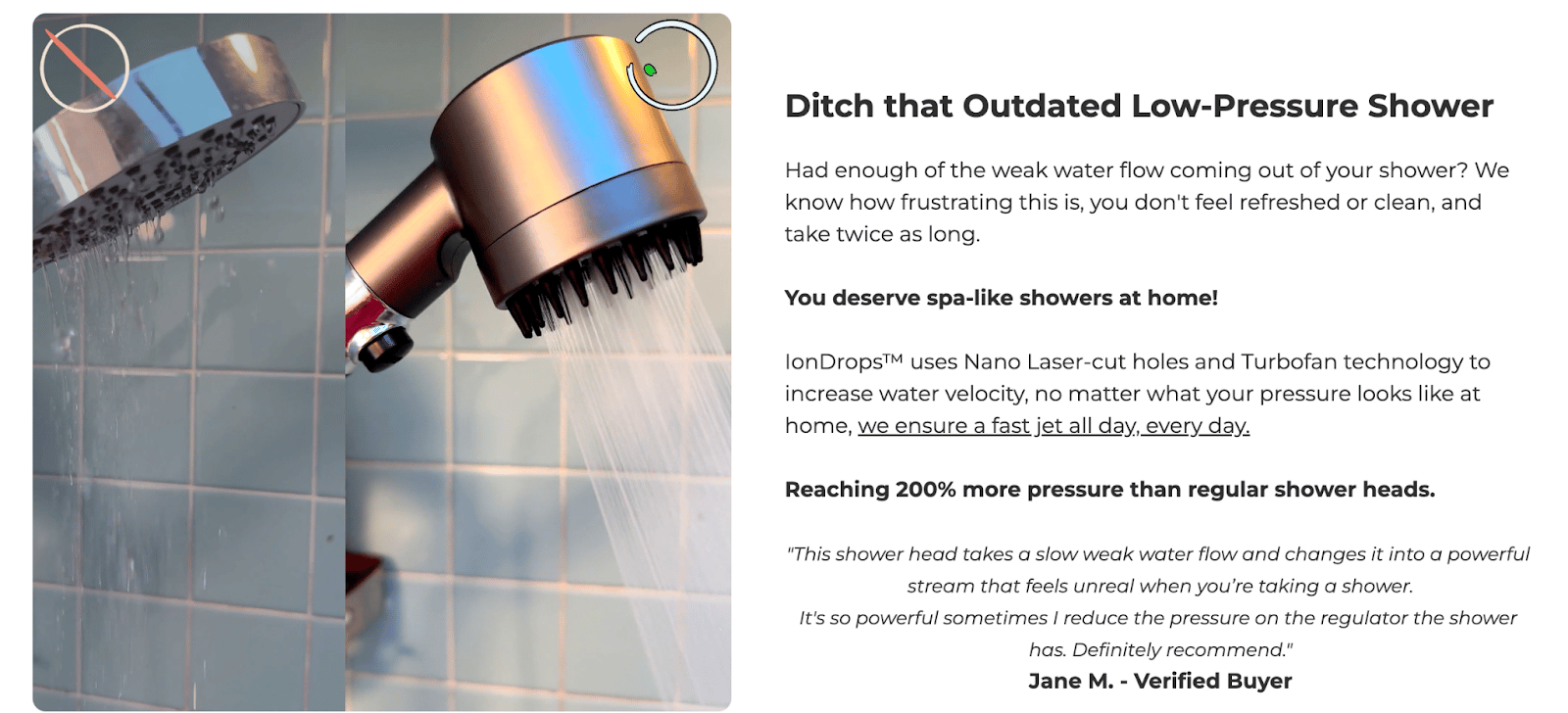 Tackle different problem variations in your testimonials (hard water, sensitive skin, low pressure)